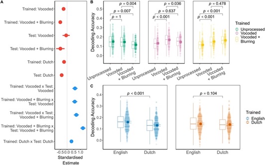 It’s possible that neural decoding techniques could also be applied in clinical settings, for example, to assess a patient’s hearing health. Speech perception, however, involves the complex interplay between sensory reception and cognitive processes originating in the brain, like learning and memory. Although this interaction is an important factor driving successful speech perception, it presents a source of ambiguity in the context of neural decoding, which may capture both sensory and cognition-related brain activity.