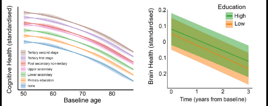 For many years, researchers have thought that higher levels of education protect against cognitive decline in later years, including dementia. An international team including Prof Rik Henson (@rhens.bsky.social) at the MRC CBU have just reported a meta-analysis across 33 countries which showed that, while more education is indeed associated with better cognitive and brain health in later life, it does not reduce the rate of decline of cognitive and brain health over subsequent years. This cross-sectional but not longitudinal association is more likely to reflect stable, early-life differences between people (e.g., genetics), which lead to different degrees of education, rather than education protecting against ageing and dementia.
