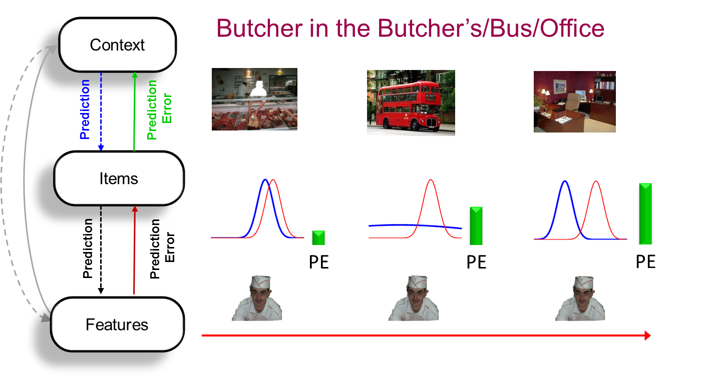 PIMMS was first outlined briefly in Henson & Gagnepain (2010). We then spent many years refining a behavioural paradigm to test its predictions while controlling for many other factors that affect memory; specifically to test how well people can remember an association between a scene and an object. PIMMS predicts that their memory will be proportional to the divergence between the prior (the probability of that object given the scene) and the evidence (the probability of that object given sensory input). Sure enough, in three different scenarios where we manipulated the prior and/or evidence, the PIMMS predictions were confirmed by Greve et al. (2017). This perspective on prediction error distinguishes surprise from novelty (Quent et al., 2021). We are currently exploring ways to dissociate PE from attentional resources, though simple modelling shows how difficult this can be behaviourally (Kaula & Henson, 2021), and so we are also planning neuroimaging experiments that might better disentangle the relationship between PE, attention and subsequent memory.